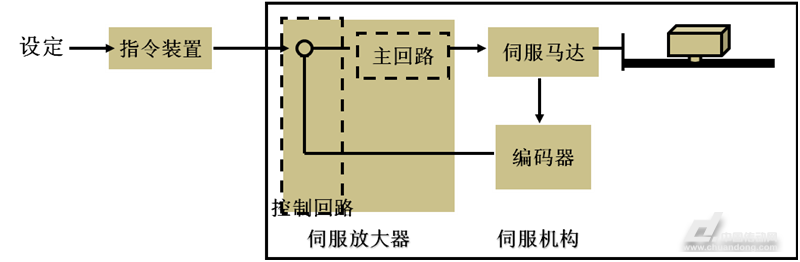伺服系統(tǒng)是指:以物體的位置、方位、姿勢等為控制量,組成能跟蹤目標(biāo)的任意變化的控制系統(tǒng)。下圖是一個伺服系統(tǒng)的主要構(gòu)成部分: